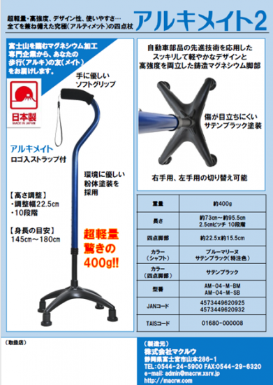 超軽量・高強度・高デザイン性・高操作性を兼ね備えた究極(アルティメット)の四点杖。シャフトと脚部ともにマグネシウム合金製で約400gを実現。自動車部品の先端技術を応用し、洗練された軽快フォルムと強度を両立。長さ73〜95.5cm(2.5cmピッチ10段階)で自在に調節。究極の使いやすさを体感ください。